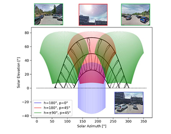 Ejemplo de estimación de la posición solar según el punto de vista de la posición de la cámara en una posición de una ruta urbana. Fuente: “Estimation of solar resource for vehicle-integrated photovoltaics in urban environments using image-based shade detection”