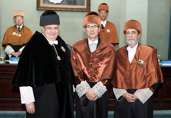 El nuevo doctor 'honoris causa' de la UPM, Antoine Kremer, entre el rector Carlos Conde y su padrino en la investidura, Luis Gil. / UPM.