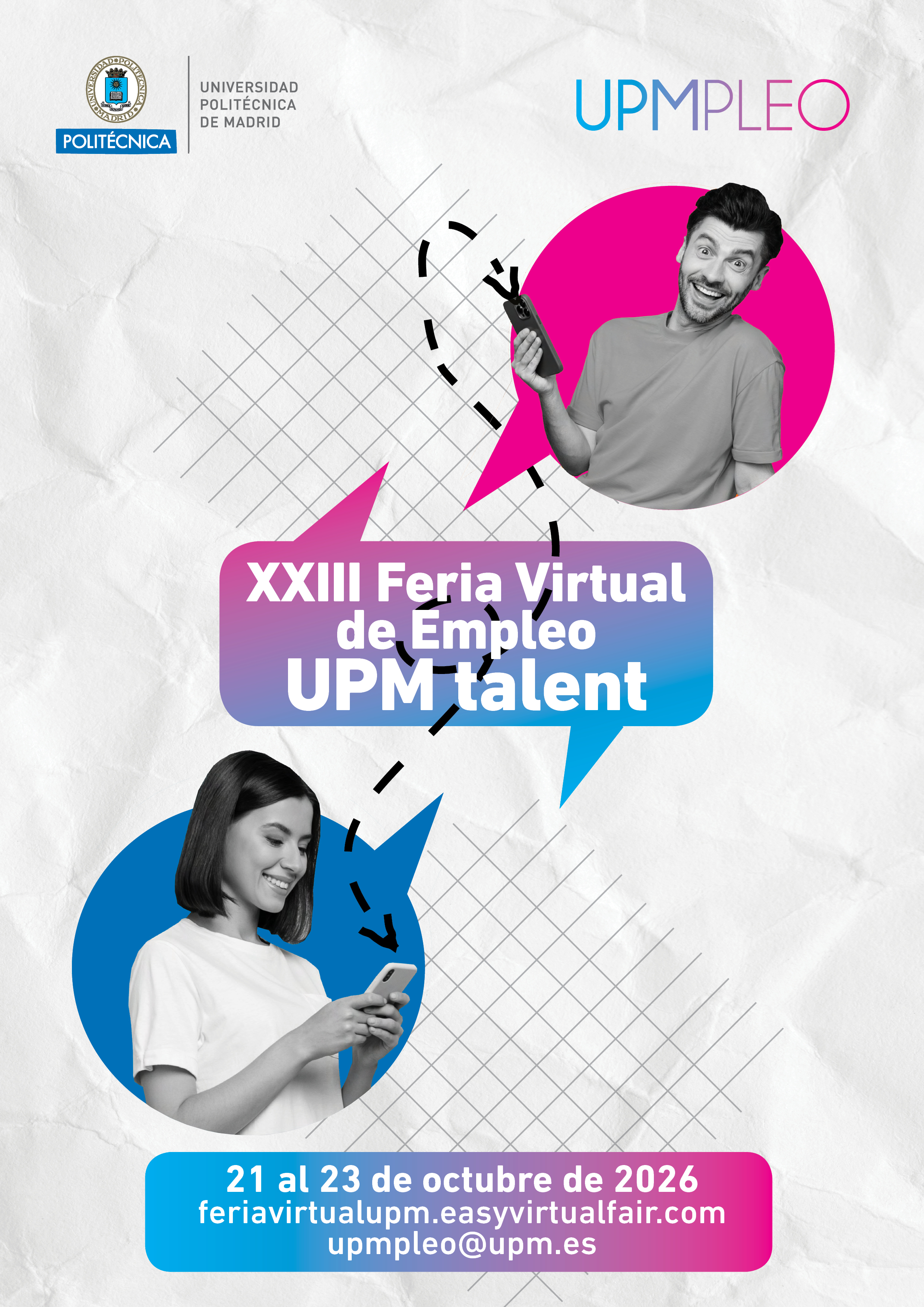 Nuestro evento global de empleo XXIII FERIA VIRTUAL DE EMPLEO UPM tendrá lugar durante los días 21, 22 y 23 de octubre de 2026. Si quieres participar como empresa puedes escribirnos a feria.upmpleo@upm.es