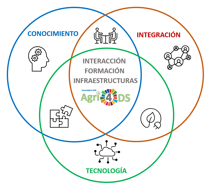 La ComunidaD+I UPM en Agricultura Digitalizada y Sostenible para el Desarrollo de la Sociedad y la Bioeconomía (Agricultura 4DS) pretende abordar de una forma interdisciplinar los retos científicos y tecnológicos para una producción agrícola sostenible del siglo XXI, alineándose con los Objetivos de desarrollo Sostenible (ODS) y las políticas y estrategias europeas con incidencia en agricultura, alimentación y medioambiente.