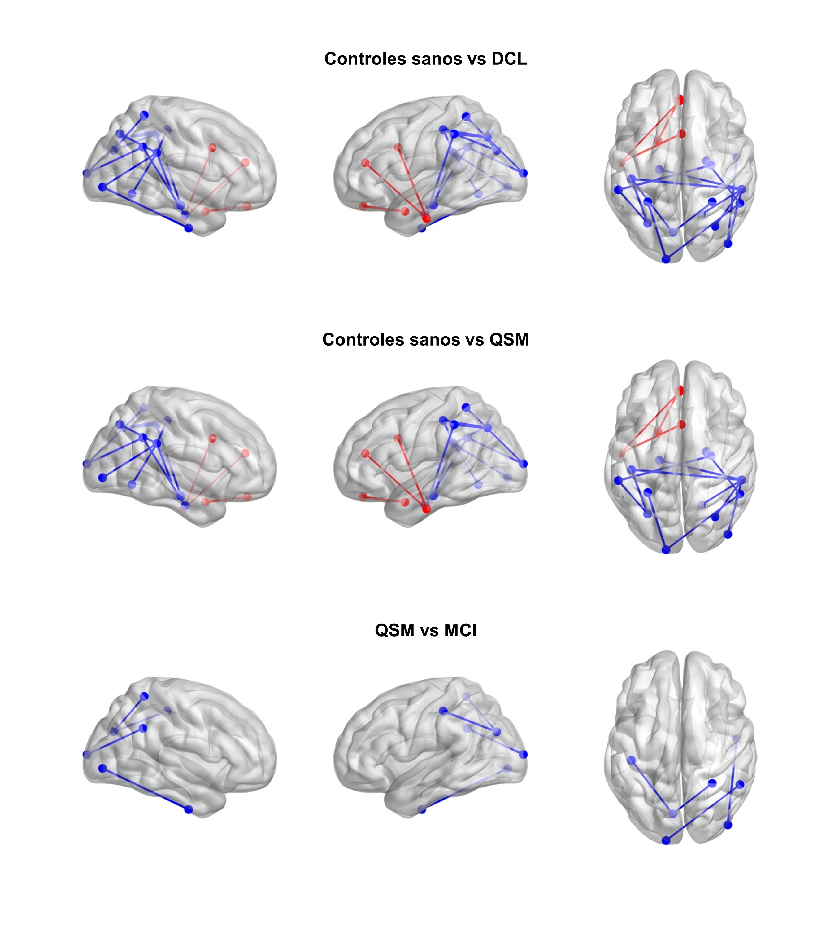 La figura muestra diferencias en conectividad entre los tres grupos estudiados. En la segunda fila de imagenes podemos observar como las personas mayores con QSM muestran una disminución de conectividad en zonas posteriores (lineas azules) y un incremento en zonas anteriores (líneas rojas) comparados con el grupo control. Además, este patrón de alteraciones es muy similar al que exhiben los pacientes con DCL (primera fila de imágenes). Foto:UPM.