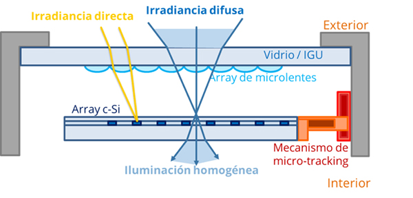 Una persiana que genera electricidad a partir del sol Investigadores de la UPM han desarrollado una nueva ventana translúcida que bloquea la luz solar directa y la transforma en energía eléctrica, mejorando así el confort de los usuarios y el balance energético del edificio. ¿Imaginas contar con una persiana “invisible” que bloquee los rayos del sol convirtiéndolos en electricidad, y que a la vez te permita seguir contemplando el azul del cielo? Es lo que ha desarrollado un equipo de investigadores del Instituto de Energía Solar de la Universidad Politécnica de Madrid (UPM). El módulo, en proceso de ser patentado, permite proteger a los usuarios de los edificios de la luz directa y reducir a la vez su necesidad de luz artificial, a la vez que se genera electricidad solar para autoconsumo. “Los módulos fotovoltaicos semitransparentes convencionales (BIPV, del inglés building-integrated photovoltaics) utilizan células espaciadas para convertir una parte de la radiación solar en electricidad y transmitir el resto hacia el interior del edificio, lo que produce deslumbramientos molestos a los usuarios. Nuestro diseño, por el contrario, utiliza un sistema basado en micro-ópticas para convertir toda la luz directa en electricidad, a la vez que se transmite la radiación difusa proveniente del cielo azul como iluminación natural diáfana para el edificio”, explica Almudena García Sánchez, investigadora de la UPM. “Ofrece una iluminación confortable y sin deslumbramiento, ya que la luz transmitida tiene las características cromáticas de la luz solar (similar al cielo azul del exterior), pero con una probabilidad muy baja de deslumbramiento por no transmitir los rayos de luz directa, lo que significa que mejora el bienestar de los usuarios en comparación con los módulos BIPV semitransparentes convencionales que producen patrones de luz y sombra de alto contraste”. De este modo, mediante el uso de este dispositivo, los usuarios de los edificios pueden bloquear la radiación solar directa cuando es molesta, pero manteniendo una cierta iluminación natural que permita reducir las necesidades de iluminación artificial, a la vez que se produce generación de electricidad renovable sin emisiones de carbono, lo que mejora el balance energético y la huella de carbono del edificio. Los rayos de luz solar directa que transmiten los módulos convencionales de integración arquitectónica semi-transparentes pueden producir deslumbramiento (izquierda). Sin embargo, el módulo desarrollado desvía los rayos de sol hacia tiras de células solares que la convierten en electricidad y transmite únicamente la luz difusa de la bóveda celeste (derecha). Para ello, el módulo integra un novedoso diseño de óptica de micro-concentración asimétrica que separa las componentes directa y difusa de la radiación solar. La componente directa se concentra sobre un conjunto de delgadas tiras de células solares que la convierten en electricidad con alta eficiencia. Las células están dispuestas sobre una placa transparente móvil que permite transmitir la radiación difusa hacia el interior y que se desplaza mediante un sistema de seguimiento solar integrado para asegurar que las células captan la luz directa a medida que cambia la posición del sol a lo largo del día. Esa alta eficiencia y su buen funcionamiento incluso cuando el sol está muy inclinado respecto de la ventana es una de las principales ventajas del nuevo dispositivo ideado por los investigadores de la UPM: "La eficiencia óptica es superior al 70 % en una amplia gama de ángulos de incidencia, lo que garantiza una alta eficiencia eléctrica y densidad de potencia durante todo el día en todas las estaciones". El nuevo sistema permite integrarse en los edificios tanto en disposición vertical como horizontal, lo que posibilita utilizar esta persiana inteligente tanto en ventanas como lucernarios. "El módulo está diseñado para utilizarse como elemento translúcido de la envolvente del edificio", explicaron los académicos. "Puede integrarse en elementos de tejado o de fachada donde no se requiera visión directa del exterior", explica César Domínguez, investigador principal del proyecto y profesor de la UPM, “como por ejemplo en las secciones superior e inferior de un sistema de muro cortina, manteniendo la sección central para una ventana transparente convencional”. Gestión activa de la iluminación: modo persiana y modo tragaluz “Nuestro sistema ofrece la capacidad de gestionar activamente la cantidad de luz directa transmitida según las preferencias del usuario o las necesidades ambientales, algo imposible con los módulos semitransparentes convencionales”, añade García Sánchez. “Gracias al sistema de seguimiento integrado, la posición de la placa trasera puede ajustarse para evitar que las células solares absorban la luz directa (modo persiana) y se transmita así hacia el interior del edificio si las condiciones de operación lo requieren (modo tragaluz). Esto permite modular no solo la iluminación, sino la carga térmica.” El módulo desarrollado permite conmutar entre el modo persiana (izquierda) y el modo tragaluz (derecha) en función de las necesidades de los usuarios o de las condiciones ambientales. Créditos de la imagen: Emma Fajardo, Trabajo Fin de Grado, UPM, 2025 El dispositivo creado por los investigadores responde a muchos de los problemas que presentan los módulos fotovoltaicos semitransparentes convencionales, como son la falta de gestión activa de la luz transmitida; la alta probabilidad de deslumbramiento de los usuarios; la necesidad de dispositivos adicionales de protección solar como persianas, o la baja densidad de potencia si se transmite mucha luz natural. “Esta y otras características novedosas de nuestro sistema resolverían algunos de los desafíos técnicos del vidrio solar convencional o los módulos fotovoltaicos semitransparentes para integración arq