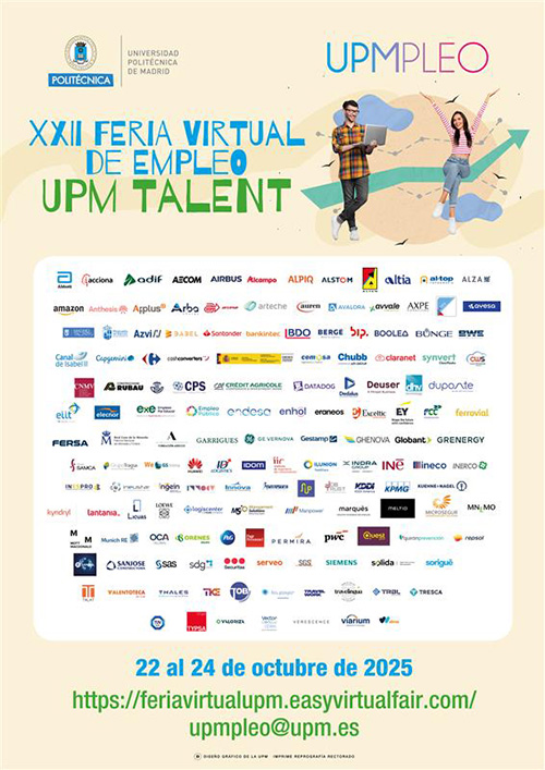 La UPM impulsa el futuro profesional de sus estudiantes La Universidad Politécnica de Madrid apuesta por el talento de sus estudiantes y titulados, ayudándoles a incorporarse al mundo laboral con iniciativas que combinan orientación, formación y oportunidades reales de empleo. A través de UPMPLEO, la Universidad Politécnica de Madrid refuerza su compromiso con la empleabilidad de sus estudiantes y titulados mediante la organización de diversas actividades orientadas a la búsqueda de empleo y el desarrollo profesional. Entre las principales iniciativas destacan la Feria Virtual de Empleo UPM y la Agenda TalentUPM que, cada curso, acercan a los jóvenes al mercado laboral y potencian sus competencias personales y profesionales. La XXII edición de la Feria Virtual de Empleo UPM, celebrada del 22 al 24 de octubre, ha contado con la participación de cerca de 160 empresas que ofrecieron 543 ofertas de empleo para perfiles técnicos dirigidas a estudiantes y titulados UPM. El evento, ya consolidado como una cita de referencia tanto para las empresas colaboradoras como para los titulados UPM, permite acercar el talento universitario a las necesidades del mercado laboral. La próxima Feria Virtual de Empleo UPM se celebrará los días 21, 22 y 23 de octubre de 2026, y promete seguir siendo un espacio clave para el encuentro entre empresas y el talento UPM. Mejora tus competencias personales y profesionales con Agenda TalentUPM Esta iniciativa se complementa con un programa de formación previo y paralelo: la Agenda TalentUPM. Orientada a fortalecer las competencias profesionales de los participantes, la agenda ofrece ponencias y talleres sobre imagen profesional en LinkedIn, liderazgo, comunicación efectiva o el uso del portal de empleo UPM. La Agenda TalentUPM es una propuesta dinámica que ofrece actividades a lo largo de todo el curso académico. Su objetivo es dotar a los estudiantes y recién titulados de las herramientas necesarias para mejorar su proyección profesional, su imagen digital y su preparación para los procesos de selección. Más información e inscripción en las actividades de orientación laboral y Agenda TalentUPM disponible en: https://www.upm.es/Estudiantes/EmpleoPracticas/OrientacionLaboral |