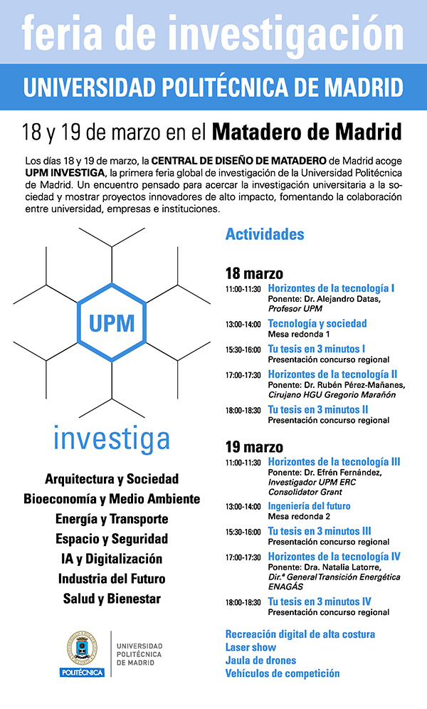 La UPM exhibe en el Matadero Madrid la investigación más avanzada La Universidad Politécnica de Madrid celebra los próximos 18 y 19 de marzo la primera edición de UPM Investiga, una muestra de investigación singular e interactiva nunca antes vista en Madrid. La cita será en la Central de Diseño de Matadero Madrid. UPM investiga bajo el lema “Ven y descubre la tecnología del futuro”, se convierte en una presentación en la que la UPM exhibe toda su capacidad científica y tecnológica, mostrando cómo a través de su actividad, los profesores, estudiantes e investigadores de la UPM están escribiendo el futuro de la humanidad. Para ello, se acercará la investigación a la sociedad de una manera práctica e interactiva y dando visibilidad al impacto real de los proyectos desarrollados en esta universidad. Descubrir la tecnología del futuro La exposición contará con espacios dedicados a siete grandes ámbitos de conocimiento que reflejan las principales líneas de investigación de la UPM: Arquitectura y Sociedad; Bioeconomía y Medio Ambiente; Energía y Transporte; Espacio y Seguridad; Inteligencia Artificial y Digitalización; Industria del Futuro; Salud y Bienestar. Durante, dos días, 18 y 19 de marzo, en la Central de Diseño de Matadero Madrid se podrán ver demostraciones prácticas de recreación digital de alta costura, un láser show, IA aplicada a drones, vehículos de competición o el próximo satélite que la UPM lanzará al espacio (UPM Sat-4). Además, el programa se completa con mesas redondas, concursos de tesis doctorales explicadas en tan solo 3 minutos y 4 ponencias exprés de los investigadores de la UPM, Alejandro Datas, cofundador de Thermophoton y Efrén Fernández, beneficiario de una ayuda ERC Consolidator Grant, así como Rubén Pérez-Mañanes, cirujano oncológico del Hospital General Universitario Gregorio Marañón y Natalia Latorre, ingeniera industrial por la UPM y directora general de Transición Energética de Enagás. Las actividades se desarrollarán en horario de mañana y tarde durante ambos días. |