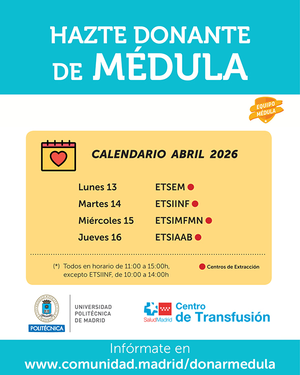 Hazte donante de médula La Universidad Politécnica de Madrid acoge hasta el jueves 16 de abril la segunda fase de la campaña Tour Médula Universidad, una iniciativa que busca promocionar e informar sobre donación de médula en las universidades públicas de Madrid. Hasta el jueves 16 de abril, los estudiantes de la UPM tienen una nueva oportunidad de participar en la segunda fase de la campaña #TourMédulaUniversidad que visita distintos centros de la Universidad para informar e informar sobre la donación de médula. En concreto, en esta segunda fase son cuatro los centros de la UPM que se convierten en puntos de información y registro de nuevos donantes. La campaña está activa hoy en la ETS de Ingeniería de Montes, Forestal y del Medio Natural, y el jueves 16 se trasladará a la ETS de Ingeniería Agronómica, Alimentaria y de Biosistemas, en horario de atención de 11:00 a 15:00 horas. La iniciativa Tour Médula Universidades consta de un punto informativo y un dispositivo sanitario con profesionales y voluntarios de las distintas universidades, que darán a conocer la donación de médula ósea entre los estudiantes. El papel de las universidades es clave en el objetivo de incrementar el número de inscritos en el registro de donantes de la Comunidad de Madrid. La campaña, organizada por séptimo año consecutivo por el Centro de Transfusión de la Comunidad de Madrid en colaboración con estos centros universitarios madrileños cuenta con la implicación de todas las escuelas y centros de la universidad. Para ser donante es necesario tener entre 18 y 40 años, pesar más de 50 kilos, estar sano y tener un índice de masa corporal (IMC) entre 20 y 35. En la campaña que se desarrolla en las universidades se extrae una muestra de sangre, que se incluye en el Registro Español de Donantes de Médula Ósea (REDMO), para comprobar si hay algún paciente compatible. La campaña #EquipoMédulaUPM comenzó en 2019. Desde entonces, cuenta anualmente con cerca de 100 voluntarios y ha incrementado el registro de donantes de médula ósea en más de 2.000 personas. A raíz de esta iniciativa, las distintas universidades públicas madrileñas se han sumado a Equipo Médula, la campaña del Centro de Transfusión de la Comunidad de Madrid. Desde que arrancó la iniciativa, son varios los alumnos de la UPM que han logrado convertirse en donantes efectivos de médula ósea para un paciente compatible. Es el caso de Alan Víctor Muela, estudiante de la ETSI de Montes, Forestal y del Medio Natural, y de Rodrigo Luengo, de la Escuela Técnica Superior de Ingenieros de Telecomunicación. Para más información se puede consultar la web www.equipomedula.org. |