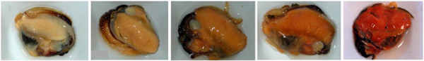 Para medir el color de los mejillones se utilizó una escala cualitativa de referencia con valores desde 1 (izquierda) hasta 5 (derecha). Fuente: Aquaculture 440 (pág. 35).