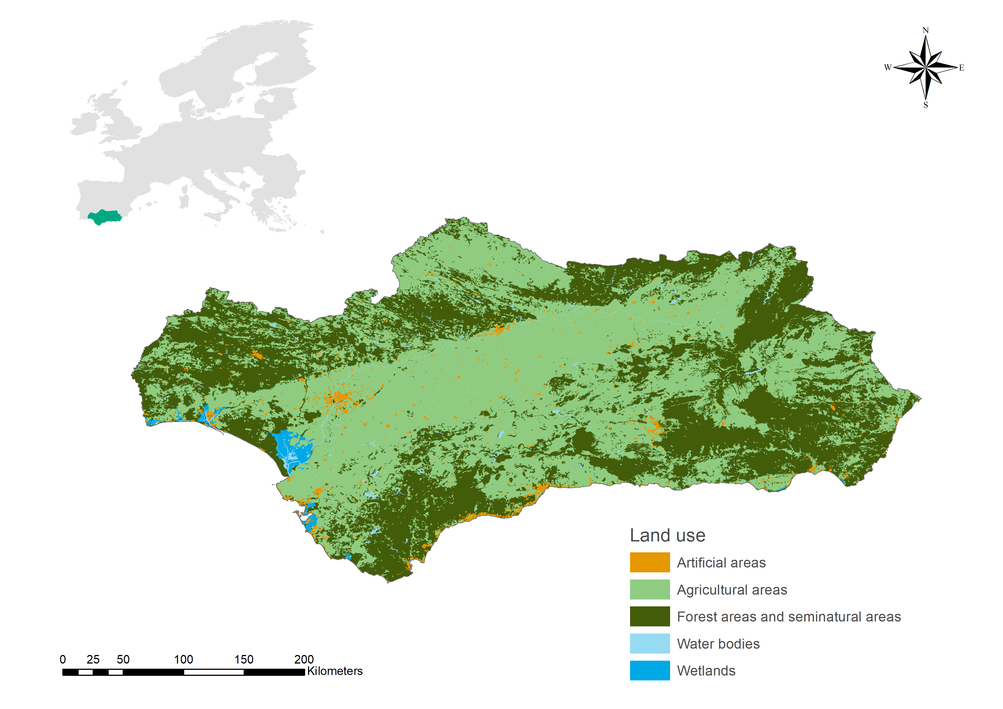 Ubicación de Andalucía y principales usos de la tierra. Fuente: Elaboración propia