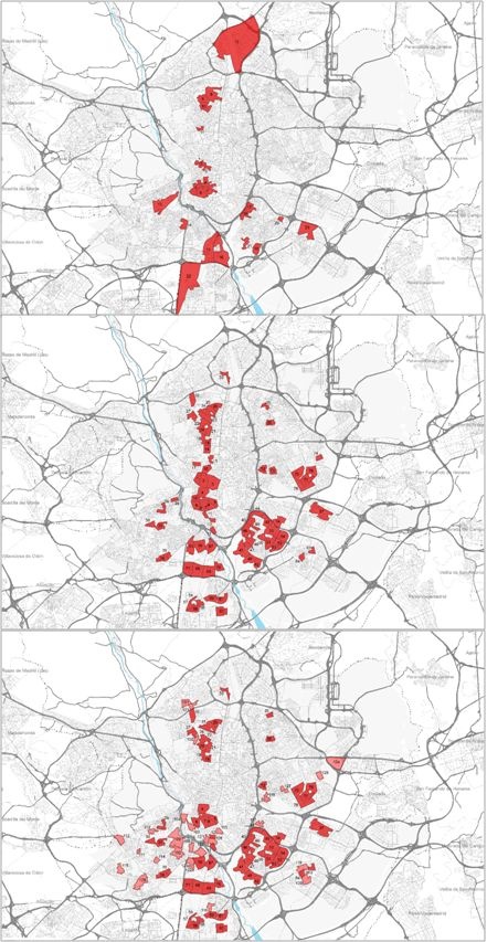 Evolución de los barrios vulnerables en Madrid (de arriba a abajo) entre 1991 y 2011. Fuente: Hernández Aja et al, 2018. Accesible en http://oa.upm.es/51015/