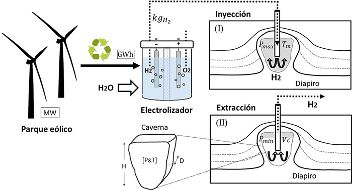 Esquema del proceso de generación, inyección y extracción de hidrógeno verde
