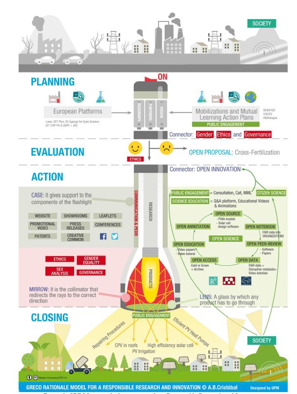 Demostrar que la aplicación de las prácticas de Open Science (y de forma más amplia de Responsible Research and Innovation, RRI) son la base para obtener productos de investigación adecuados a la sociedad del SXXI; y convertirse en una referencia básica de cómo éstas se materializan en un proyecto de I+D para que aquellos investigadores de cualquier área de conocimiento científico puedan trasladar su aplicación de forma inmediata. Estos dos son los objetivos primordiales del Proyecto GRECO (787289), un proyecto de investigación coordinado por el Instituto de Energía Solar de la Universidad Politécnica de Madrid.