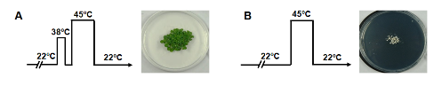 Ensayos de respuesta a calor en los que se muestra que plantas de 7 días de ‘Arabidopsis thaliana’que han sido aclimatadas (tras someterlas a un tratamiento previo a 38ºC durante 1 hora), toleran un tratamiento posterior de 45ºC durante 3h (A). Sin embargo, plantas de las mismas características no sobreviven a un tratamiento similar en ausencia del proceso de aclimatación (B). Las fotografías se tomaron 7 días después del último tratamiento de calor. En el artículo de' Plant, Cell & Environment' se comparan los cambios en el proteoma en diferentes puntos de estos dos tratamientos.