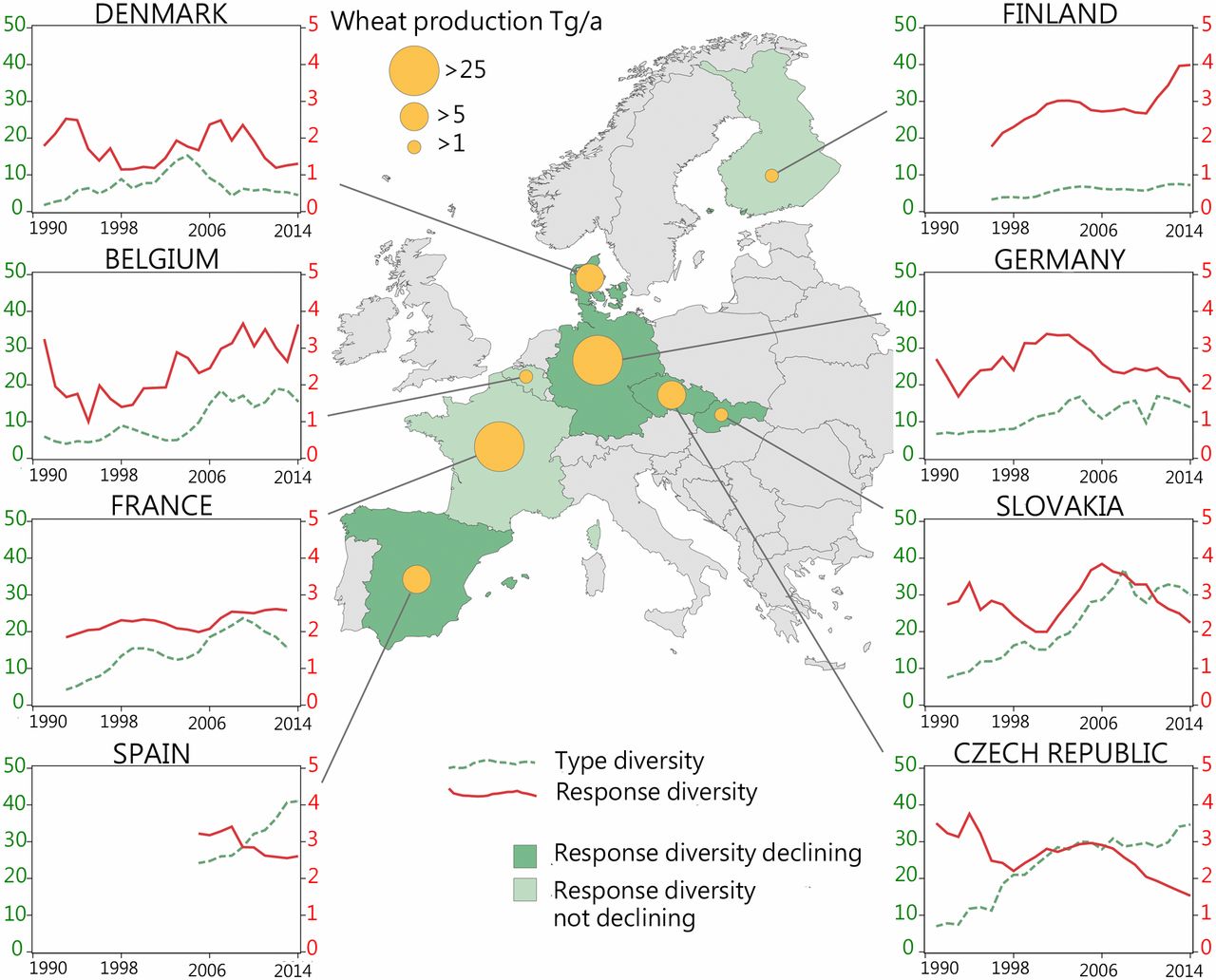 Decline en la resiliencia del trigo en los campos agrícolas de la mayoría de países europeos entre 2002-2009. La tendencia a largo plazo de la diversidad de las repuestas a patrones climáticos críticos (response diversity) ilustra la resiliencia al clima y la diversidad de los cultivos (type diversity).