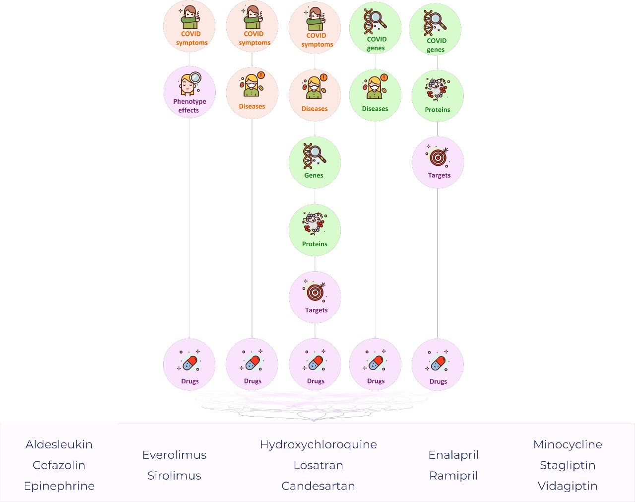 - Vía 4. A partir de los genes asociados a la COVID-19, se obtuvieron enfermedades que tuvieran genes en común. Se identificaron los fármacos indicados para tratar estas enfermedades.