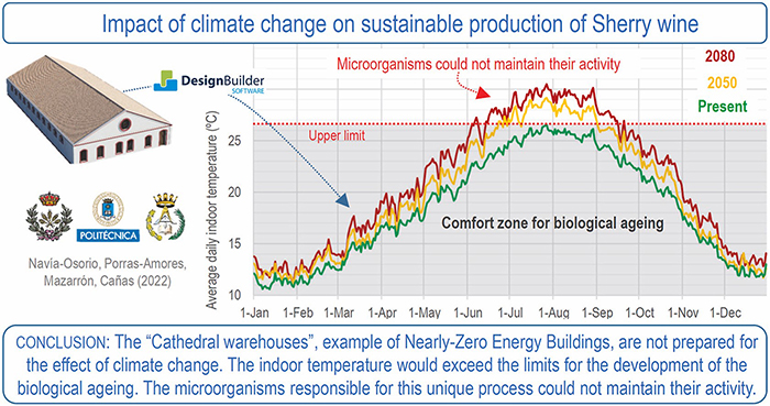 El trabajo, realizado por un equipo de investigadores de la Universidad Politécnica de Madrid, analiza el impacto que el cambio climático tendrá sobre la crianza biológica de los vinos generosos de Jerez. Durante varios años, los investigadores de la UPM han monitorizado el comportamiento térmico de una bodega para, posteriormente, desarrollar y validar un modelo informático de simulación energética de ese edificio. En base a ese modelo, han realizado simulaciones modificando las condiciones climáticas exteriores para los escenarios futuros de cambio climático propuestos por la IPCC (Intergovernmental Panel on Climate Change).