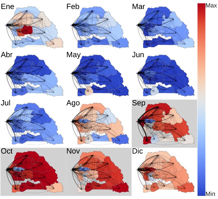 Evolución de los flujos migratorios en Senegal. Hay más inmigración (rojo) durante la época de la cosecha, que abarca septiembre, octubre y noviembre. / UPM.