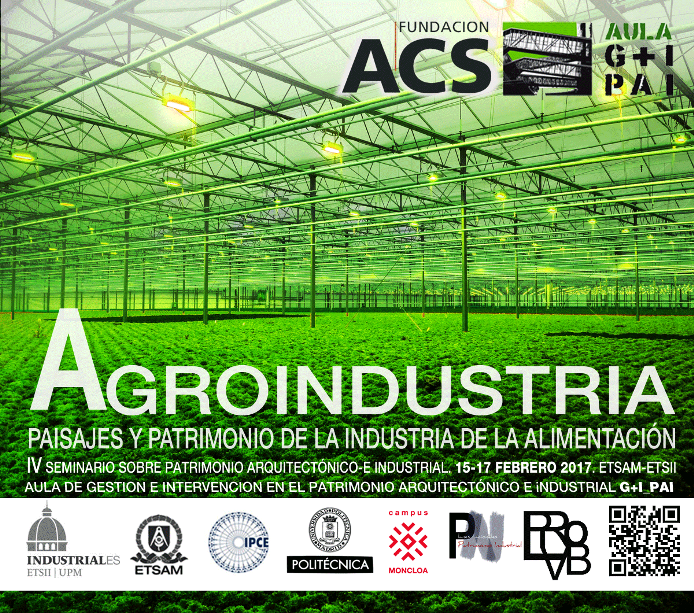 El Aula de Formación Gestión e Intervención en el Patrimonio Arquitectónico e Industrial (G+I_PAI) es fruto de un convenio entre la Fundación ACS y la Universidad Politécnica de Madrid. Organiza, entre los días 15 y 17 de febrero de 2017, el IV Seminario Internacional sobre Patrimonio Arquitectónico e Industrial, bajo el título “Agroindustria. Paisajes y Patrimonio de la Industria de la Alimentación”. Los interesados en presentar una comunicación tienen de plazo hasta el 1 de noviembre (fecha prorrogada) para enviar un resumen de su propuesta. Más información en: http://gipai.aq.upm.es.