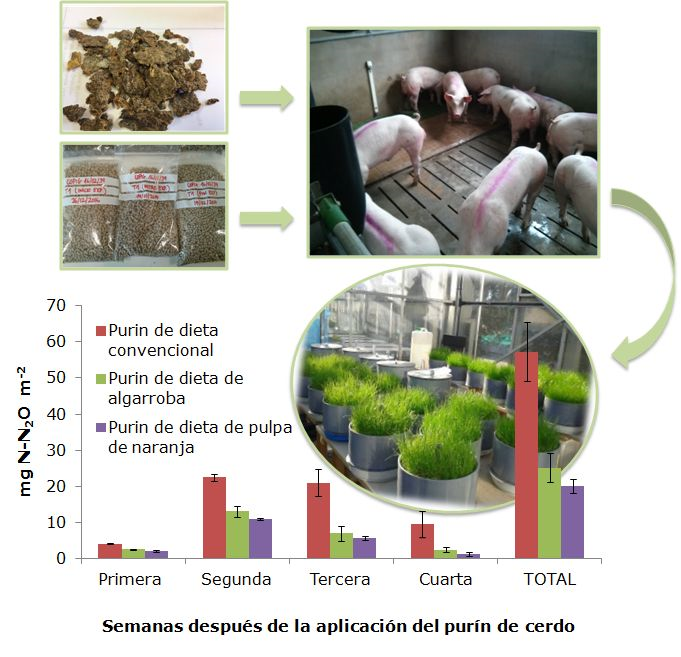 Para realizar este estudio se seleccionaron subproductos típicos de la región Mediterránea, la pulpa de naranja y la algarroba. Estos subproductos se incorporaron en dietas comerciales de ganado porcino en sustitución de cereales, respetando el equilibrio que estas dietas precisan para cubrir los requerimientos de los animales. Se comprobó que, obviamente, los componentes excretados a través de las heces y orina (purines) -por ejemplo las fracciones nitrogenadas, lignina, compuestos fenólicos, etc.- variaron en función de la dieta. Los purines se aplicaron como fertilizantes a un suelo agrícola cultivado con raigrás, una planta forrajera que se utiliza como alimento para el ganado. Las emisiones de N2O se compararon con las generadas en un suelo donde se había aplicado un purín obtenido de cerdos alimentados con una dieta convencional.