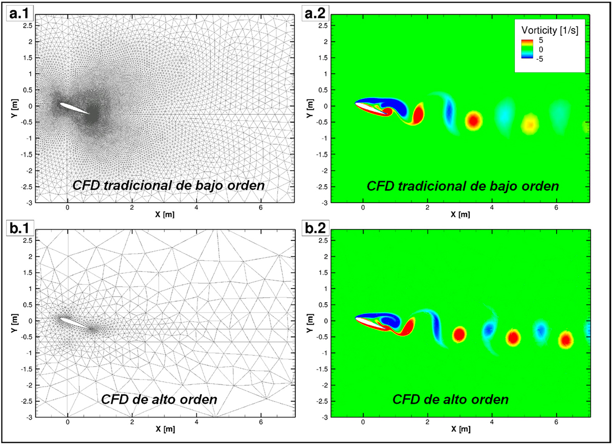 Actualmente, las herramientas de simulación basadas en la Dinámica de Fluidos Computacional (CFD) utilizan aproximaciones de bajo orden (típicamente de segundo orden). Sin embargo, existen nuevos métodos más eficaces, los denominados métodos de alto orden, que se fundamentan en la introducción de polinomios de alto orden dentro de cada elemento computacional, lo que permite una mejor aproximación a la solución numérica. Al hacerlo, la precisión de la solución mejora y el error numérico disminuye de manera exponencial.