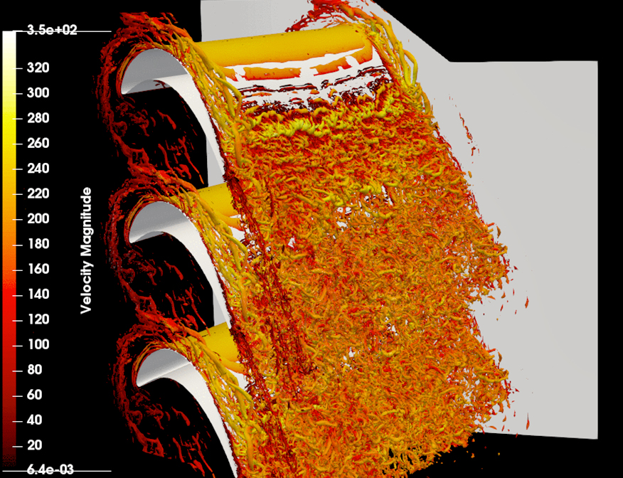 Álabes de turbina, en régimen turbulento, resuelto con un código de alto orden. Su precisión permite la captura de estructuras turbulentas de múltiples escalas.