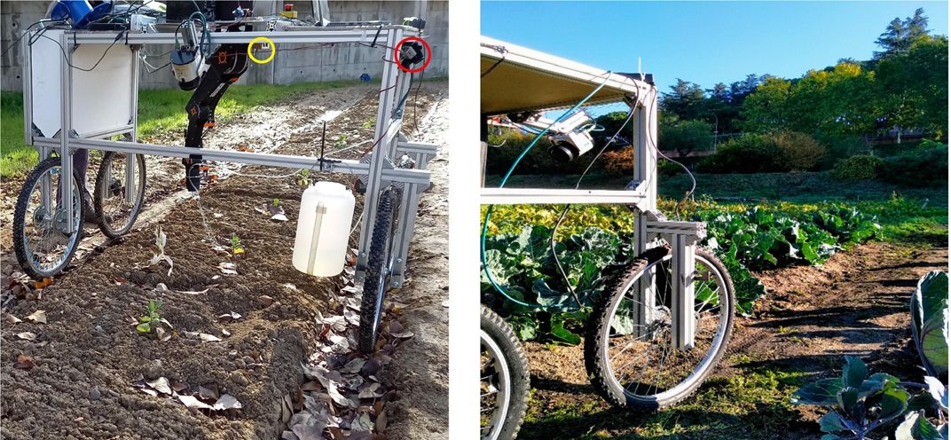 La plataforma robótica desarrollada entrenando en uno de los campos de prácticas de la ETSIAAB-UPM. Fuente: “Robotic Fertilization in Strip Cropping using a CNN Vegetables Detection-Characterization Method”. Computers and Electronics in Agriculture.