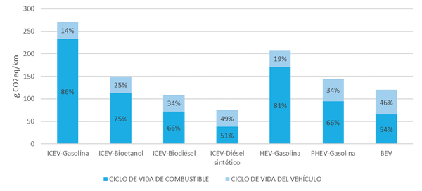 Para los vehículos de combustión interna, híbridos e híbridos enchufables que emplean gasolina fósil, la importancia relativa del ciclo de vida del vehículo se sitúa en torno al 14 %, 19 % y 34 %, respectivamente; menor que en el caso de los vehículos eléctricos, pero en ningún caso despreciable.