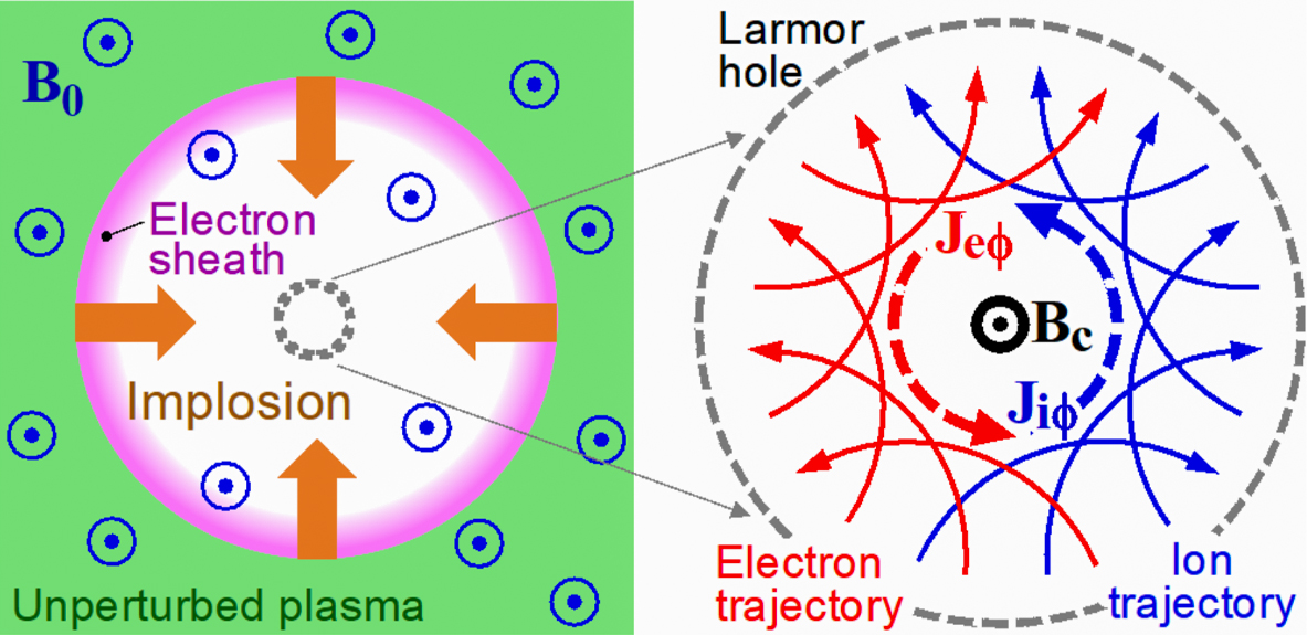 Principio de la implosión de microtubos huecos magnetizados con el campo predefinido B0. (a) Vista superior de la dinámica del plasma. Los electrones rápidos producidos por el láser conducen la expansión del plasma al hueco central. (b) Se genera un campo magnético ultra-intenso en las proximidades del eje debido a las corrientes azimutales ultra-altas formadas colectivamente por electrones relativistas e iones.