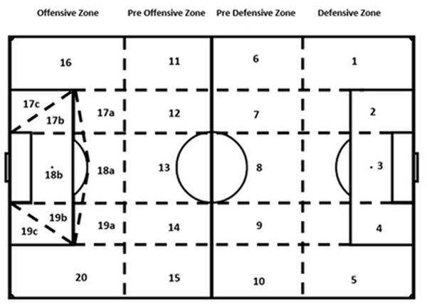 Respecto a la zona del campo desde donde se da el pase, cabe destacar que las zonas en las que aumenta la probabilidad de acabar la jugada con éxito van de la 11 a la 20, según el esquema de la figura. Además, la zona predefensiva central (zona 8 de la figura) es la que mayor incidencia tiene sobre el número de pases, seguida de la zona preofensiva central (zona 13) y la zona preofensiva en su parte derecha (zona 11). También cabe destacar que el llegar a la zona ofensiva conlleva casi un 50% más de probabilidades de acabar la jugada con eficacia.