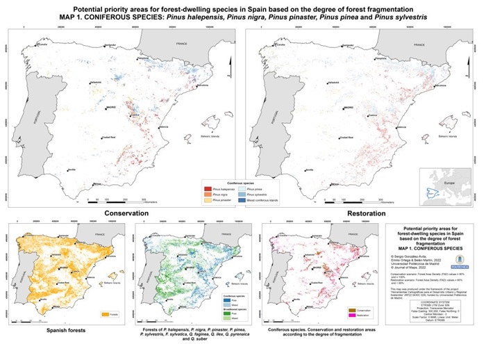 En este contexto, un grupo de investigadores de la Escuela Técnica Superior de la Ingeniería de Montes, Forestal y del Medio Natural (ETSIMFMN) de la Universidad Politécnica de Madrid (UPM) ha cuantificado el grado de fragmentación de los bosques españoles mediante la medición de determinados atributos espaciales, denominados ‘Índices de Paisaje’. Uno de estos índices, es la FAD (‘Forest Area Density’ o ‘Densidad de Área Forestal’) que ha permitido diferenciar entre áreas para conservación (aquellas con los valores más altos de FAD, superiores al 90%) y áreas para restauración (con un nivel de fragmentación de FAD medio-bajo, entre el 60 y el 90%). En estas últimas, las actuaciones de restauración serían, en general, menos costosas que en otras con niveles de fragmentación mayores.