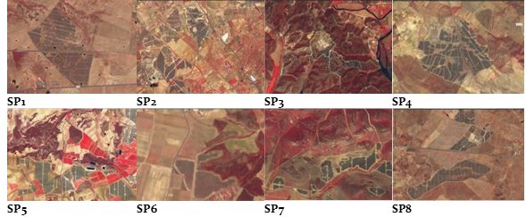 Imágenes satelitales en falso color de las ocho plantas solares (SP) analizadas. Fuente: Miguel-Ángel Muñoz-García, Luis Fialho, Guillermo P. Moreda, Fátima Baptista. Solar Energy. |