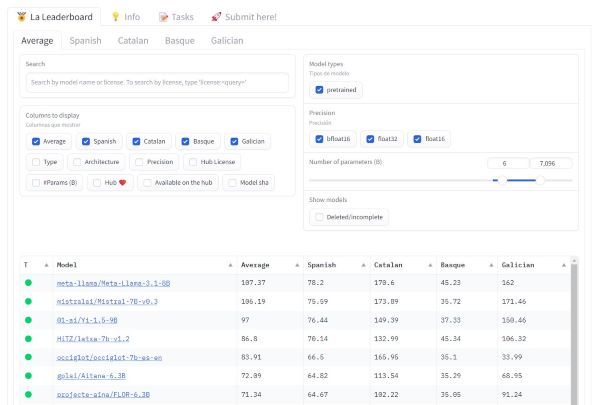 La versión inaugural de esta tabla incluye más de 50 tareas en cuatro lenguas: castellano, catalán, euskera y gallego. Evalúa las capacidades de extracción de información y resumen, cultura general, conocimiento en los dominios legal y clínico, razonamiento lógico y dominio del idioma. De este modo, ya pueden responderse preguntas como qué modelo de lenguaje genera texto de mayor calidad en español.