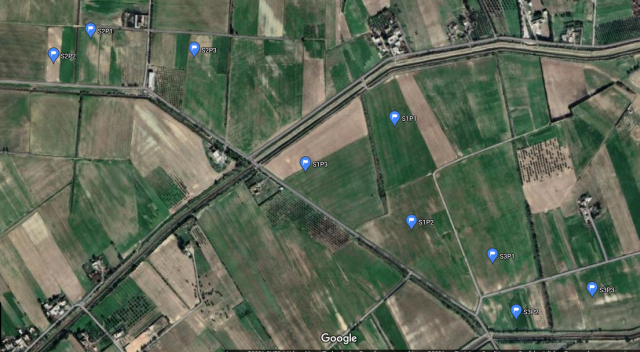 Captura de Google Maps señalando los tres puntos de muestreo: S1 (suelo nunca irrigado), S2 (5 años de irrigación) y S3 (25 años de irrigación). P1, P2 y P3 son las réplicas tomadas en cada ubicación, con el objetivo de garantizar la representatividad de las muestras. Fuente: Rakia Chouari.