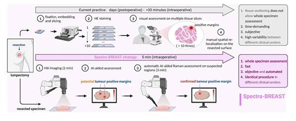 El tejido reseccionado por los cirujanos será examinado con dos técnicas innovadoras: cámaras hiperespectrales y espectroscopía Raman. Estas imágenes y espectros serán analizadas por los algoritmos de inteligencia artificial para detectar la posible presencia de células tumorales en su parte externa. En caso afirmativo, se indicará al cirujano dónde quedan células tumorales potencialmente peligrosas en la paciente.