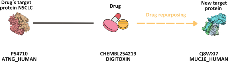 Figura 2. Representación de un potencial caso de reposicionamiento de fármacos obtenido mediante la metodología desarrollada. Un fármaco usado para tratar cáncer de pulmón como candidato potencial para tratar cáncer de mama y colon.