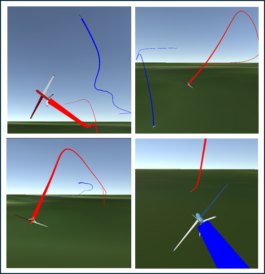 Secuencia de imágenes de una simulación que muestra la interceptación de un dron no autorizado (rojo) por un dron autónomo (azul), entrenado mediante inteligencia artificial para adaptarse a maniobras evasivas complejas.