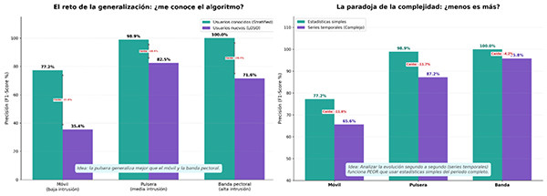 El equipo también identificó un hallazgo relevante: incorporar la variable “tiempo“ mediante análisis complejos de series temporales no mejora necesariamente la precisión de los resultados. En algunos casos, evaluar el estado fisiológico en un momento concreto a partir de datos agregados simples (como la media del ritmo cardíaco durante un minuto) resulta más eficaz que analizar la secuencia completa de cada latido.