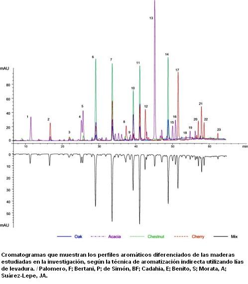 Dicha metodología se basa en la aromatización previa mediante infusión de una biomasa de levaduras para su posterior liberación en el vino. La nueva técnica permite el empleo de forma precisa de otras especies botánicas, como el cerezo, el castaño o la acacia, que a la vista de los resultados analíticos obtenidos mediante diferentes técnicas de cromatografía muestran aptitudes enológicas muy interesantes para determinadas situaciones [ver el gráfico de abajo].