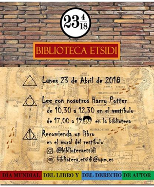 Por su parte, la Escuela Técnica Superior de Ingeniería y Diseño Industrial realizará una lectura pública de algunos fragmentos del libro “Harry Potter y la piedra filosofal” de J. R. Rowling de 10:30 a 12:30 horas en el vestíbulo de la Escuela y por la tarde, en el pasillo de la Biblioteca, de 17:00 a 19:00 horas. También invitan a que se recomiende un libro y se envíe al correo biblioteca.etsidi@upm.es, compartiendo en la cuenta de Instagram de la biblioteca, @bibliotecaetsidi o si se prefiere en el “muro” de papel que se encuentra en el vestíbulo de la Escuela.