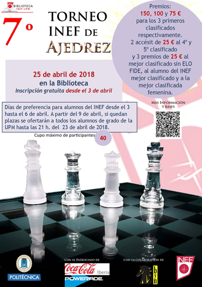 En la Facultad de Ciencias de la Actividad Física y del Deporte de la UPM (INEF) se celebra el 25 de abril, a las 16:00 horas, el 7º Torneo de Ajedrez, con la colaboración del club de ajedrez Blanco y Negro, bajo el patrocinio de Powerade.