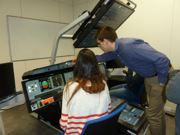 En su sede de Barajas, los estudiantes pudieron atender una clase práctica de su asignatura “Sistemas de Control Embarcados y Terrestres”. En primer lugar, vieron un simulador VPT (Virtual Procedures Training) para el A320. El nivel de automatización en cabina ha aumentado espectacularmente gracias a los avances en aviónica digital, lo que requiere un entrenamiento continuo en su manejo. Mediante pantallas táctiles, se operan todos los paneles de control de la cabina, para simular los procesos que se llevan a cabo tanto en las situaciones habituales como en situaciones críticas, lo que permite que los alumnos adquieran las habilidades necesarias para asegurar la seguridad del vuelo con gran autenticidad y funcionalidad.