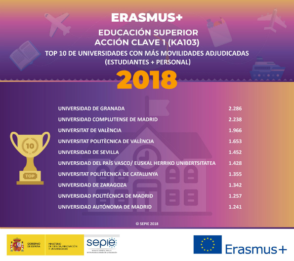 El Ministerio de Ciencia, Innovación y Universidades ha destinado 112,7 millones de euros para financiar proyectos Erasmus, lo que permitirá la movilidad a más de 58.000 estudiantes y personal de entidades educativas españolas. En España, dos entidades gestionan las becas Erasmus+, el Servicio Español para la internacionalización de la Educación (SEPIE) y la Agencia Nacional Española (ANE) integrada al Instituto de la Juventud (INJUVE).