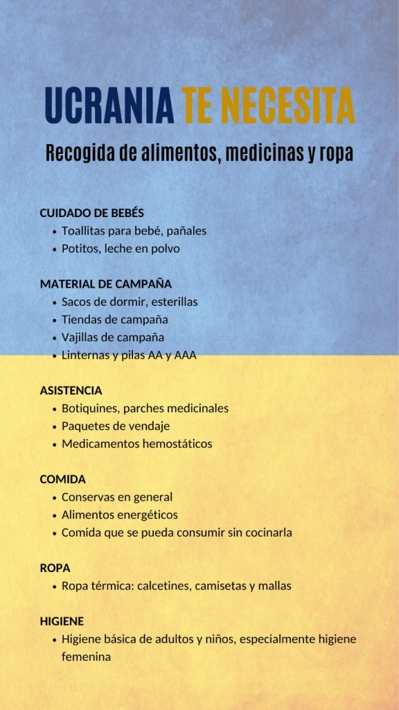 En este sentido, las diferentes delegaciones de alumnos de la Universidad han puesto en marcha una campaña de recogida de alimentos, medicinas, ropa y materiales que se enviarán directamente a los damnificados por la invasión de Ucrania.