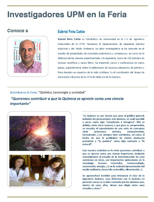 “Queremos contribuir a que la Química se aprecie como una ciencia importante”. Así explica el catedrático Gabriel Pinto, de la ETS de Ingenieros Industriales de la UPM, el objetivo que pretende con su actividad en la I Feria El aprendiz de Ingeniero de la UPM. A través del taller “Química, tecnología y sociedad”, los estudiantes que se acerquen al recinto de la ETSI Caminos podrán experimentar de forma práctica la química para descubrir sus aplicaciones en la sociedad. Todos los detalles en esta ficha.