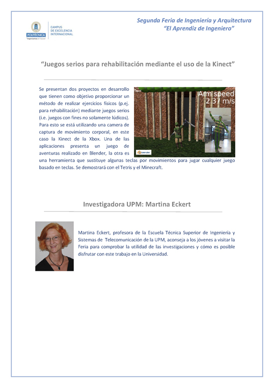 Martina Eckert, profesora de la Escuela Técnica Superior de Ingeniería y  Sistemas de  Telecomunicación de la UPM, aconseja a los jóvenes a visitar la Feria para comprobar la utilidad de las investigaciones y cómo es posible disfrutar con este trabajo en la Universidad. Su actividad: “Juegos serios para rehabilitación mediante el uso de la Kinect”.