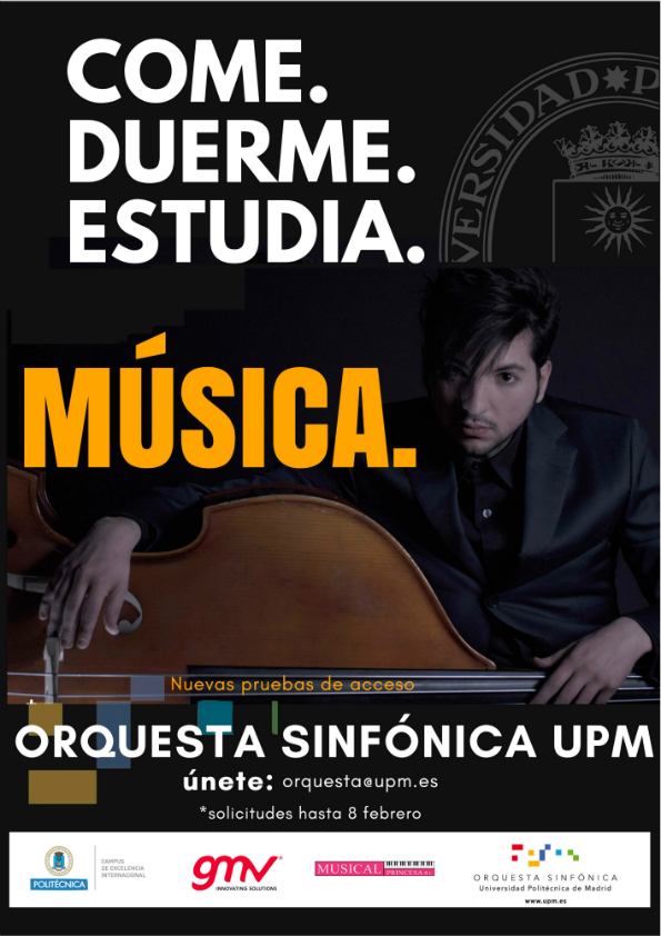 Si eres músico y quieres formar parte de una gran orquesta, no dejes pasar esta oportunidad. Para participar, solo tienes que enviar un mail a orquesta@upm.es con el asunto Solicitud y adjuntar relleno el cuestionario que puedes encontrar en este enlace http://upm.es/sfs/Rectorado/Gabinete%20del%20Rector/Notas%20de%20Prensa/formulario%20orquesta%20UPM.pdf. El plazo está abierto hasta el 8 de febrero.
