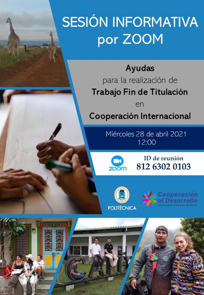 Con motivo de la apertura segundo periodo de presentación de solicitudes de la convocatoria de Ayudas para la realización de Trabajo Fin de Titulación en Cooperación Internacional, en la UPM hemos organizado una sesión informativa virtual que tendrá lugar a través de la plataforma ZOOM, el día 28 de abril de 2021 a las 12.00 de la mañana.