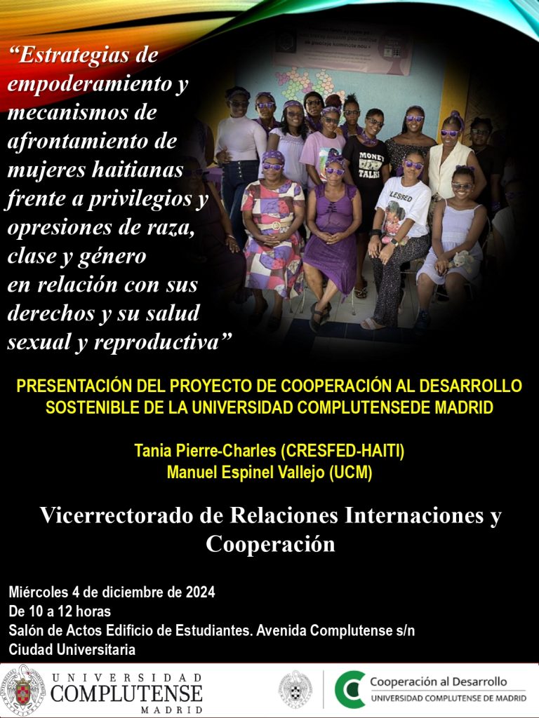 El próximo miércoles 4 de diciembre, de 10:00 a 12:00 horas, se llevará a cabo la presentación del proyecto de cooperación al desarrollo sostenible “Estrategias de empoderamiento y mecanismos de afrontamiento de mujeres haitianas frente a privilegios y opresiones de raza, clase y género en relación con sus derechos y su salud sexual y reproductiva”.