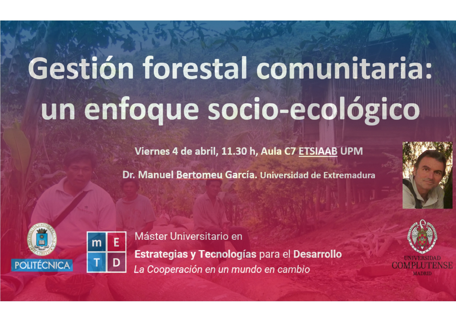 En el marco de la asignatura Forestería Comunitaria del Máster Universitario en Estrategias y Tecnologías para el Desarrollo (#masterETD), impartida por Sonia Roig Gómez, tenemos el placer de invitarte a la conferencia titulada “Gestión forestal comunitaria: un enfoque socio-ecológico”.