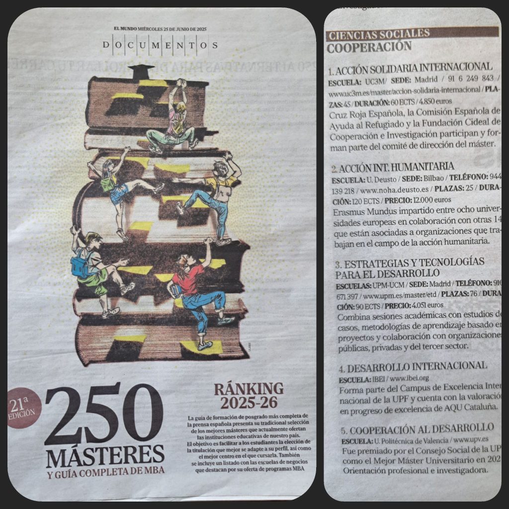 El #MásterETD ocupa la tercera posición en el área de Ciencias Sociales en la especialidad de Cooperación en el Ranking especial de estudios de posgrado del diario El Mundo publicado este 2025.