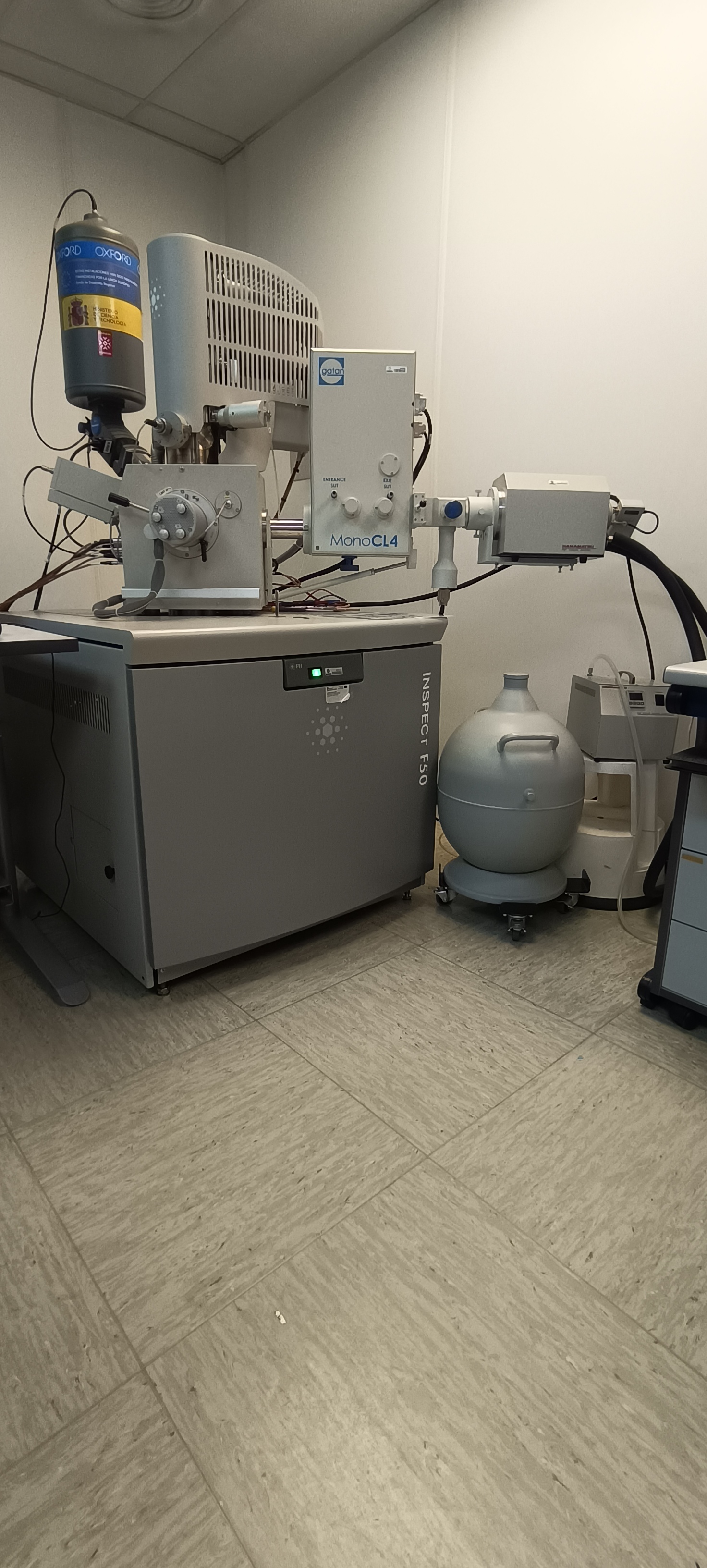 Detección en el rango infrarrojo (300nm a 1700nm) incluye un detector de tubo fotomultiplicador (IRPMT17) que requiere de refrigeración con nitrógeno líquido, Interruptor óptico para el montaje de un segundo detector, rejilla de 600l/mm, y dewar para nitrógeno líquido con 25 litros de capacidad, necesario para la correcta refrigeración del detector IRPMT17. Este detector será montado en el microscopio electrónico de barrido SEM FEI INSPECT F50 existente en el ISOM y es compatible con el sistema de cátodo-luminiscencia MONOCL4 de GATAN también instalado en la actualidad en dicho equipo FESEM. Dicho sistema de CL estará dedicado a la caracterización óptica de muestras obtenidas a través de crecimiento epitaxial de estructuras basadas en los Nitruros del grupo III (GaN, AlN e InN) así como de Arsenuros