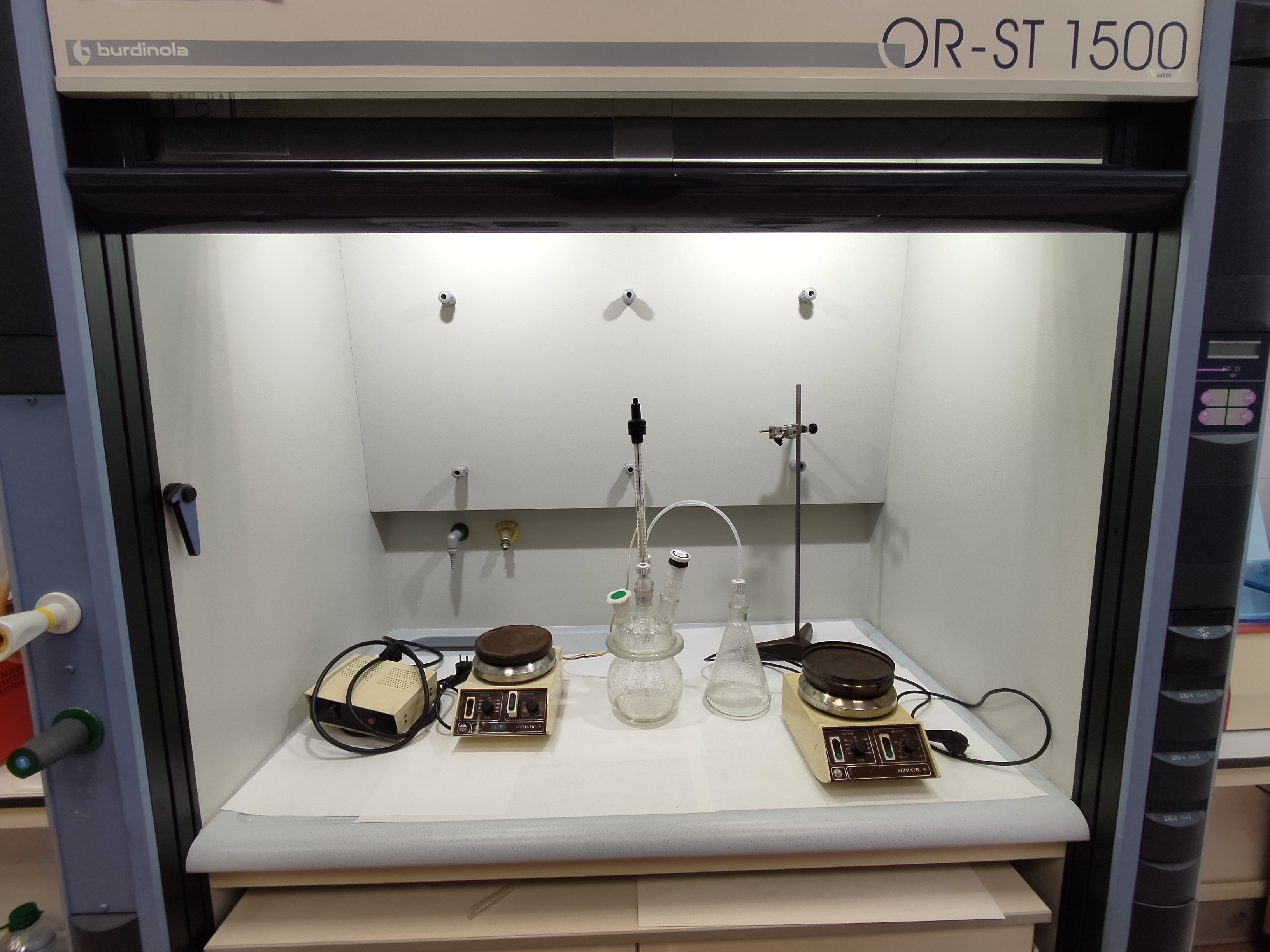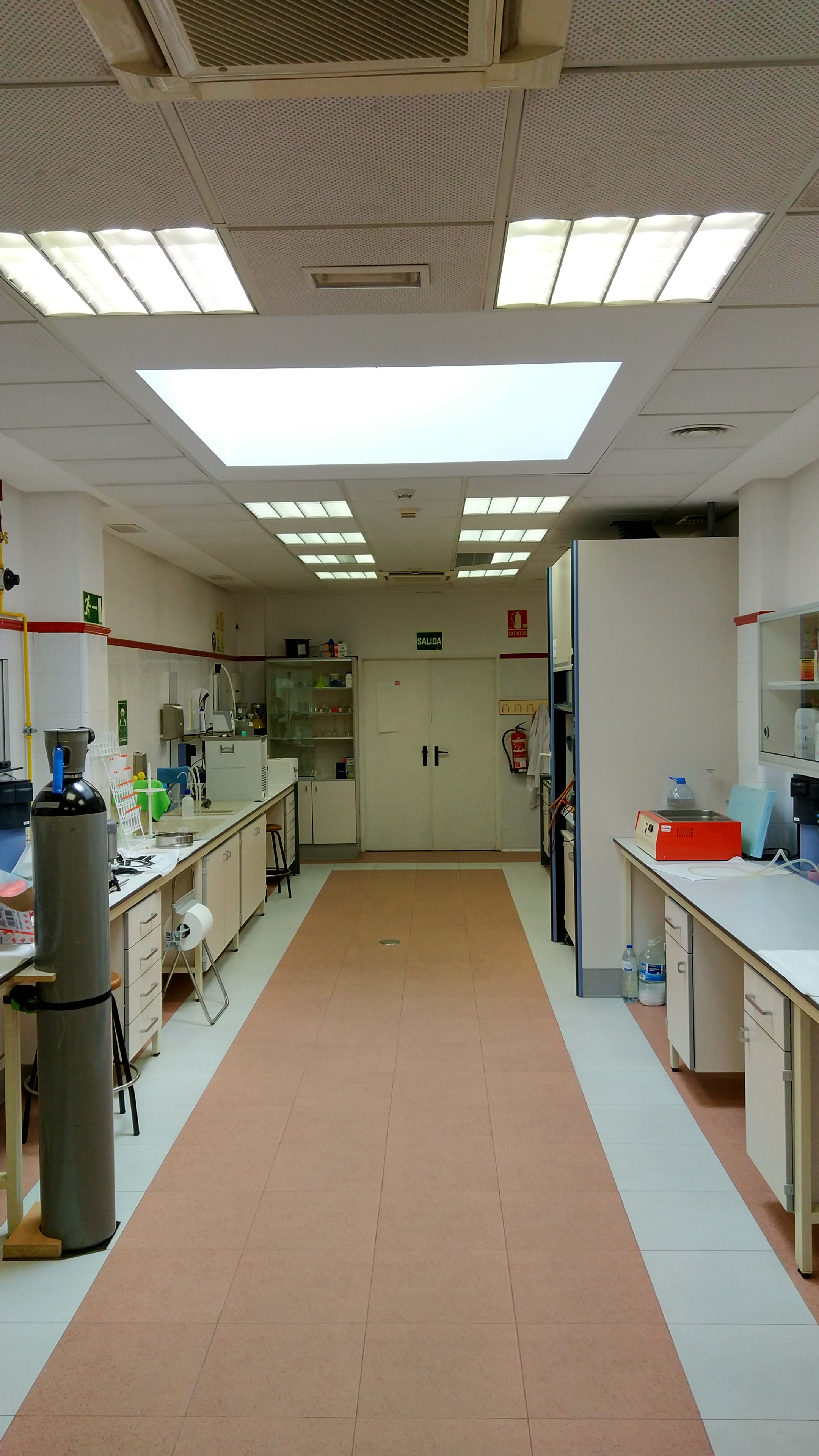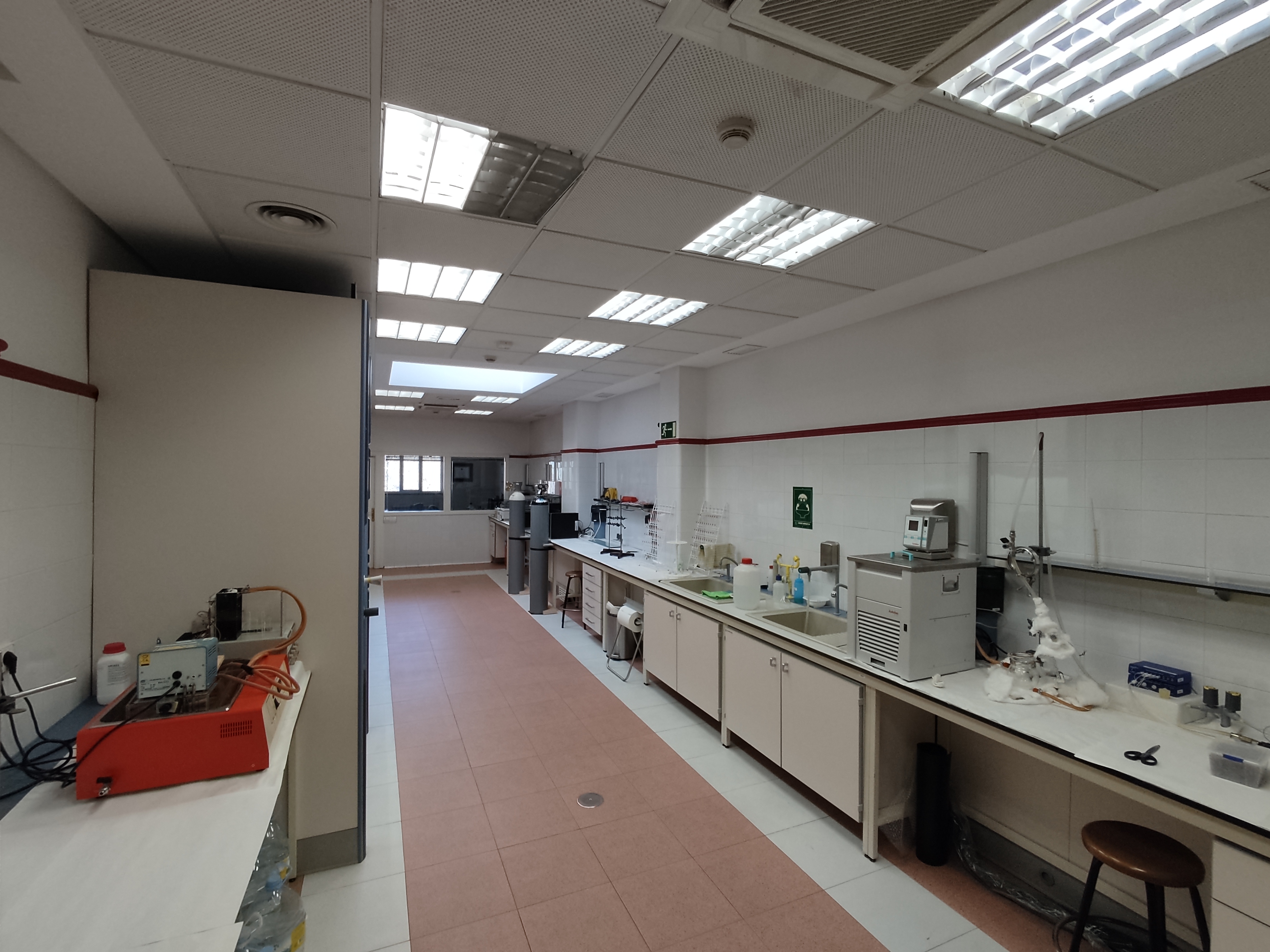 Laboratorio con una superficie de 46m2 equipado con campana de gases de alto flujo, agua corriente y poyatas de trabajo con tomas de corriente de 220 V a 50 Hz.